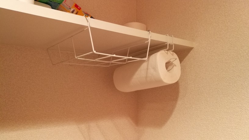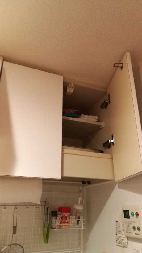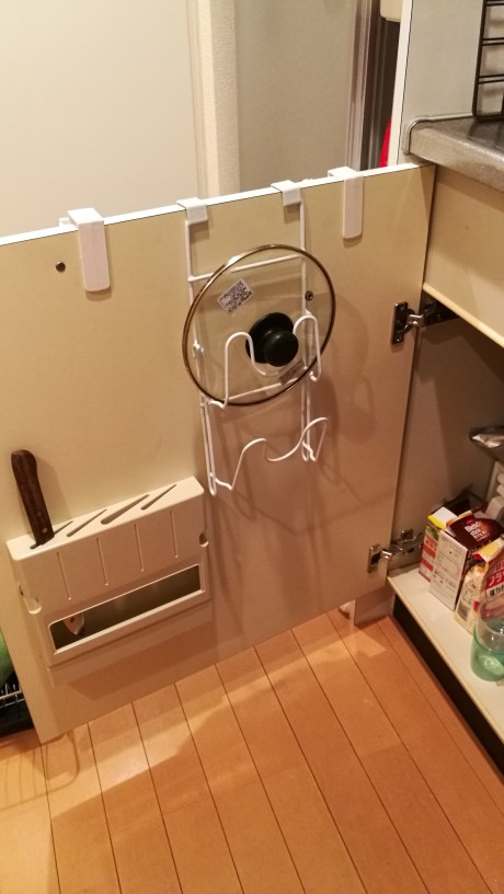 流し台上の収納扉に引っかけて、こうやってキッチンタオルかけたり、